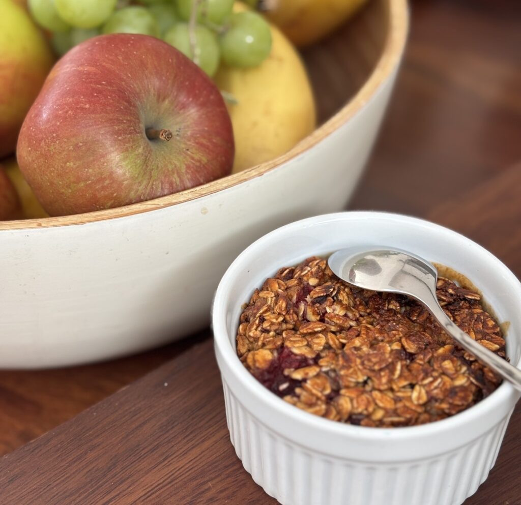 Mix all the ingredients in a bowl and pour evenly into four ramekins. Bake at 180 degrees Celsius for 20 minutes. Serve warm with Greek yogurt or yogurt substitute on the side. Enjoy!